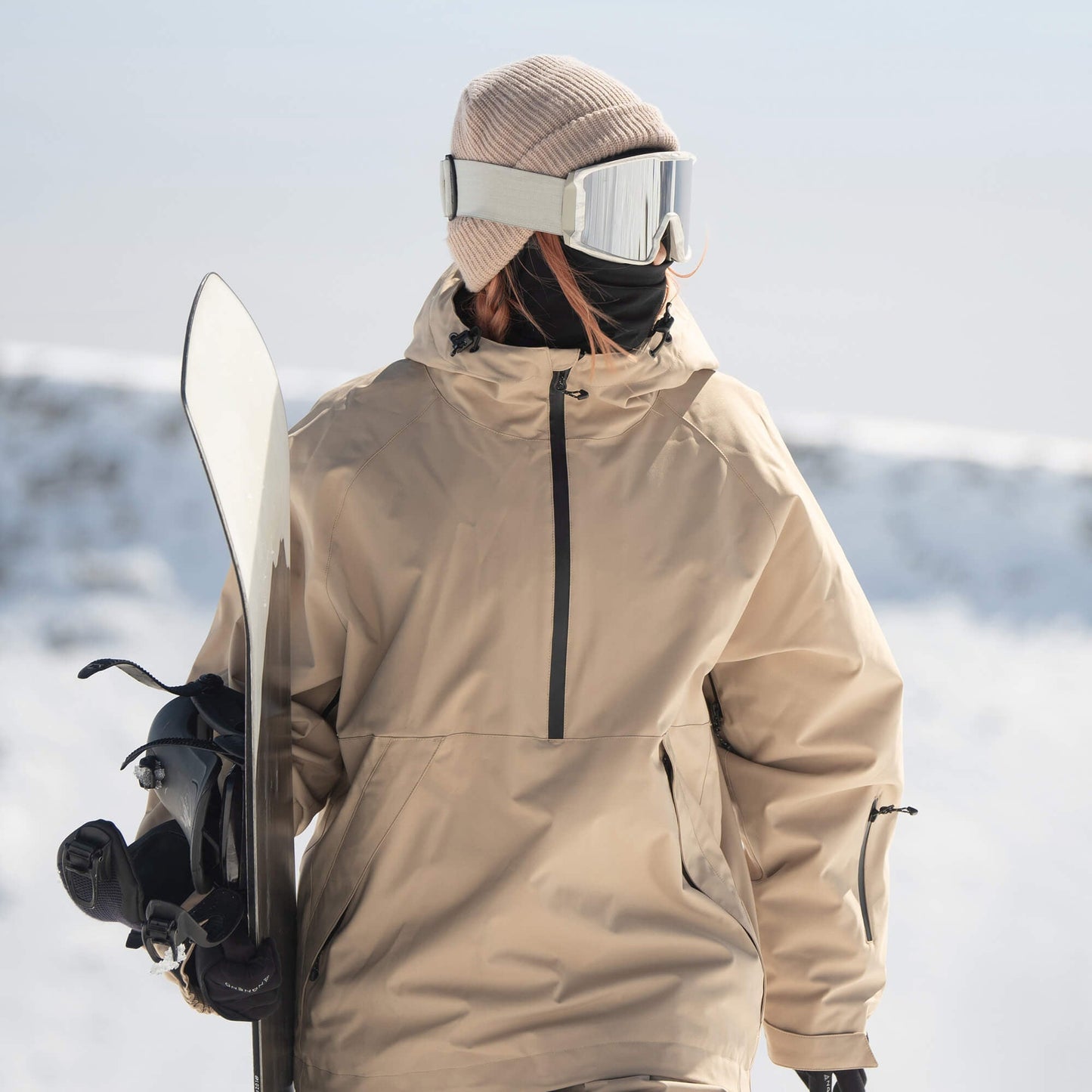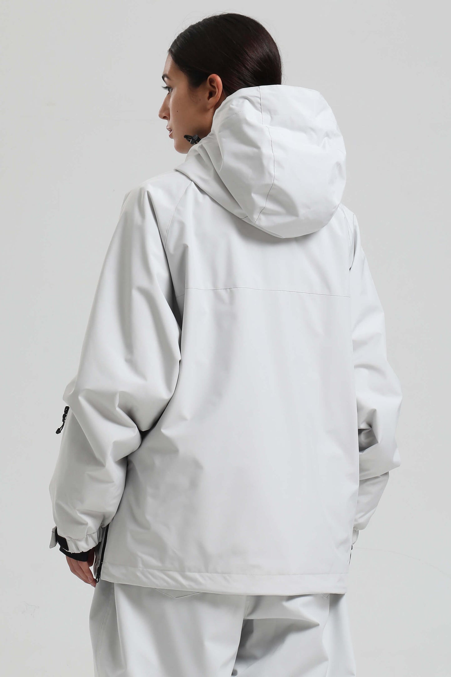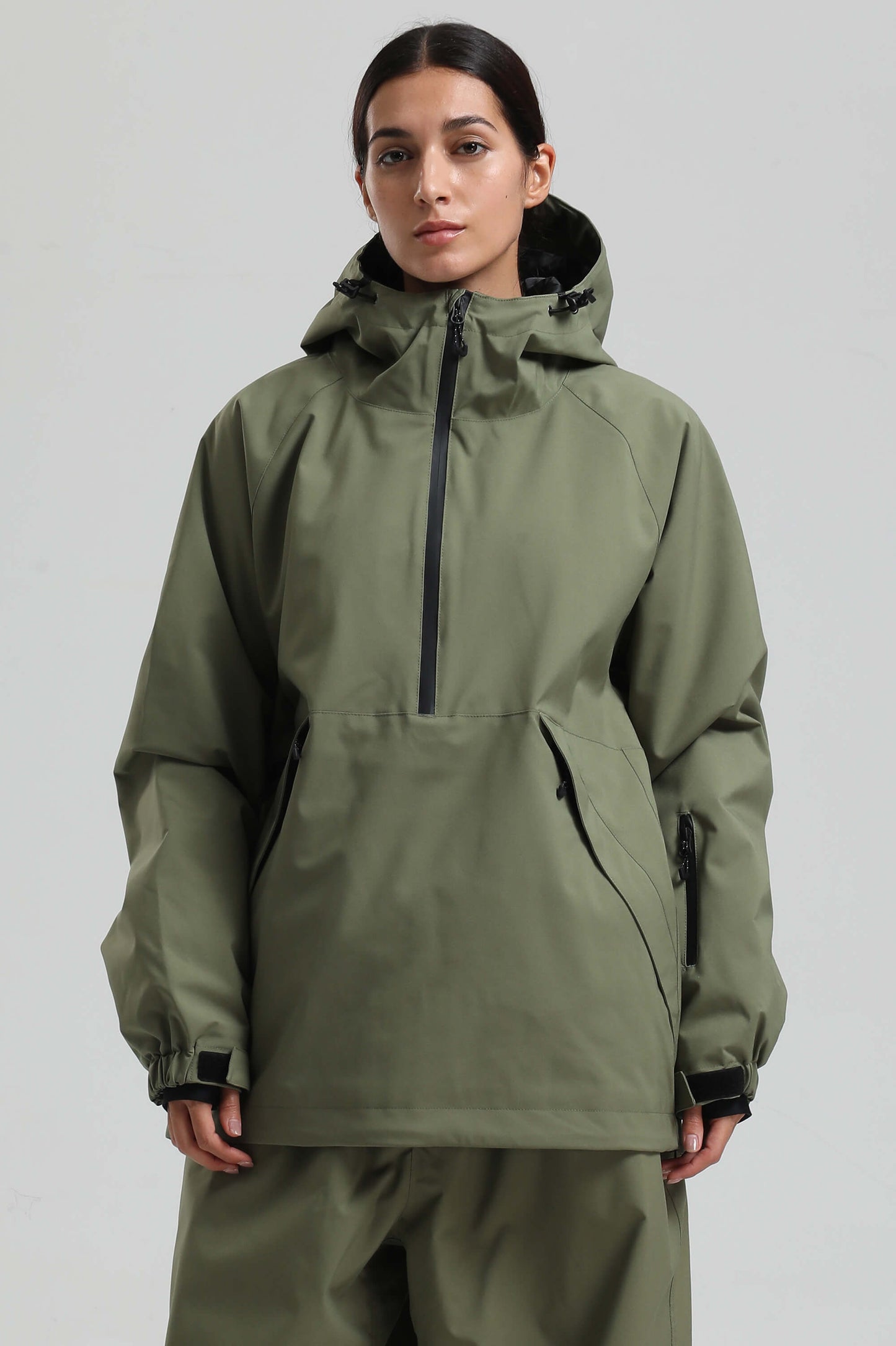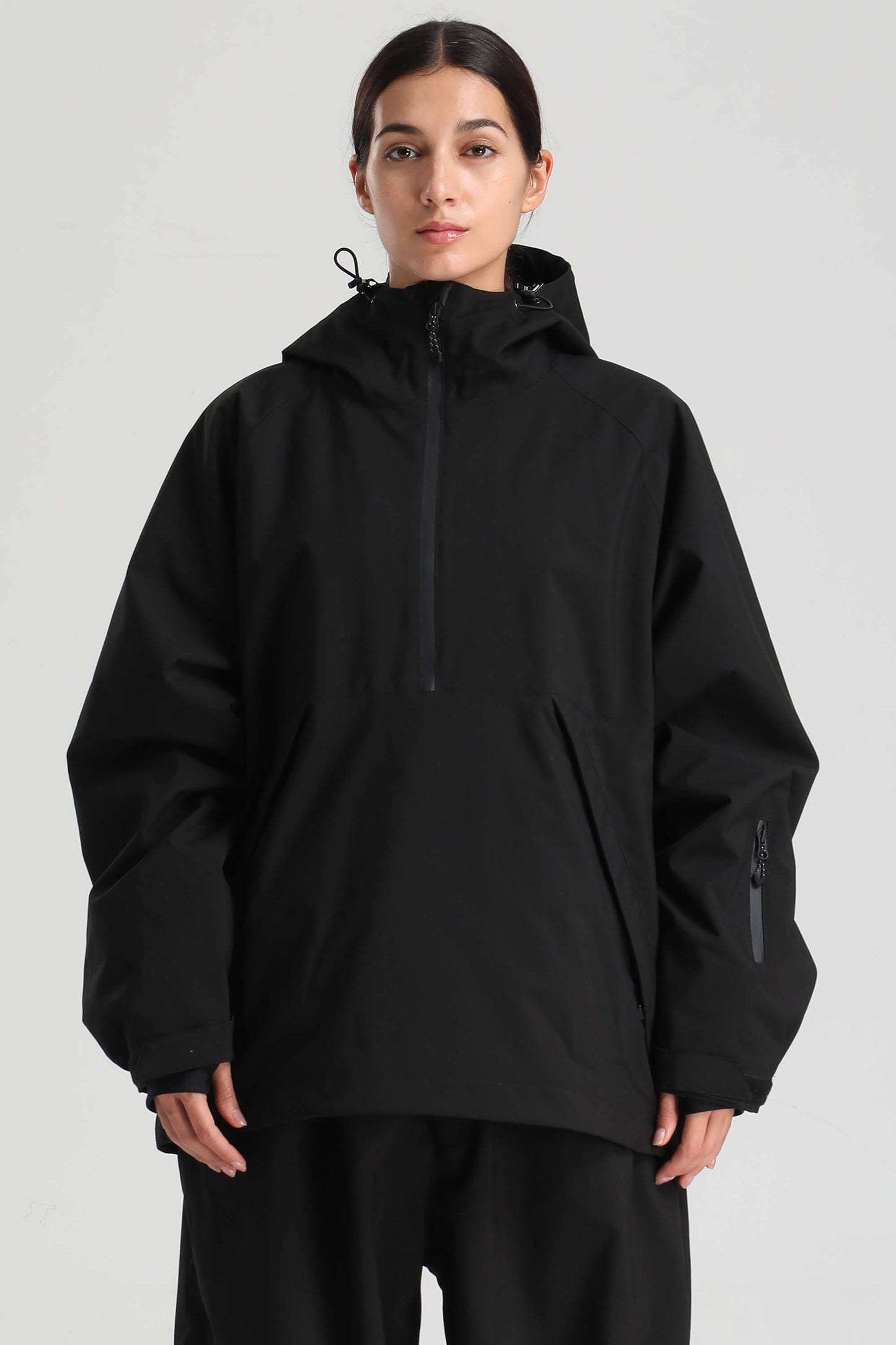 Built for snowy days, this oversized anorak features a 15K waterproof, 10K breathable shell with sealed YKK zippers and a durable water-resistant coating. A side two-way zip, underarm vent, and half-zip front offer airflow control, while thumbhole cuffs, a powder skirt, and zip pockets keep you ready for the mountain.